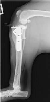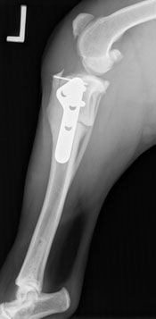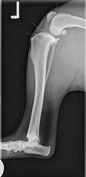 Fen was absolutely stable throughout surgery, and the rotation of the tibial plateau in both knees went well. After a night of hospitalization, Fen went home the next day, perky and moving well. He wanted to get back to his active lifestyle right away so his people had had to work diligently to hold him back. Recheck radiographs were taken 5 weeks after surgery, and Fen had already healed 60-70% of the cut. As you can see by the softening of the edges from the post-op radiograph to the 5 week recheck.