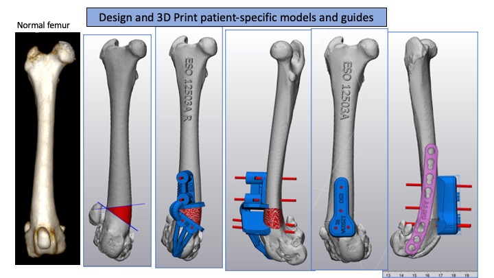 The CT scans allowed our surgeons to assess the extent of the deformities and then to create digital 3D modeling to plan the complex bone corrections. They used this information to design and 3D print specific guides that would be sterilized and used during each of Huck's surgeries. Use of custom guides allows for a dry run surgical rehearsal prior to surgery, preparation of the implants for surgery, and an accurate correction for a very challenging problem. We created the 3D models and 3D printed guides in collaboration with fellow orthopedic surgeon, Dr. Jason Bleedorn, who now works at Colorado State University.